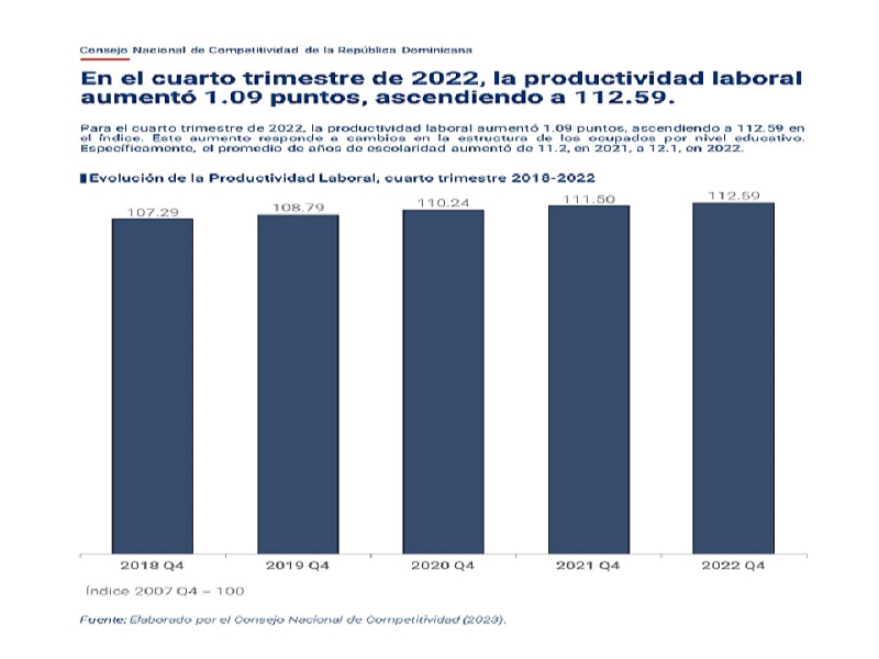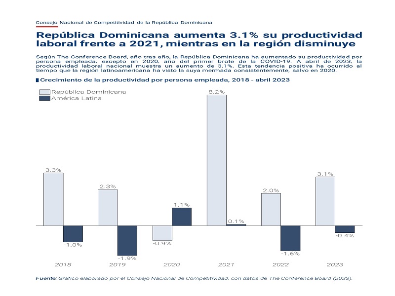 Según datos de The Conference Board (TCB), año tras año, la República Dominicana ha aumentado su productividad por persona empleada, excepto en 2020, año del primer brote de la COVID-19. A abril de 2023, la productividad laboral nacional muestra un aumento de 3.1%. Esta tendencia positiva ha ocurrido al tiempo que la región latinoamericana ha visto la suya mermada consistentemente, salvo en 2020. La República Dominicana ha crecido a una tasa anual compuesta del 3.0%, mientras que la región decreció un 0.6% en el mismo periodo.